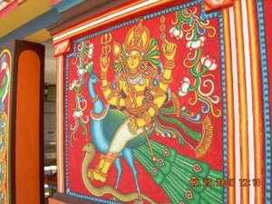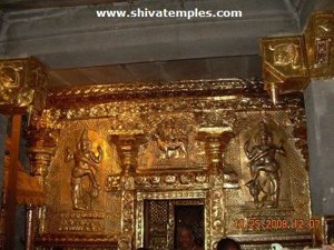 The walls along the prakaram are illustrated with colorful sculptures and paintings. The wall before the sanctum is cladded with a glittering copper plate and we can see the copper-plated forms of Dwarapalakas and Kaduveli Sidhdhar.