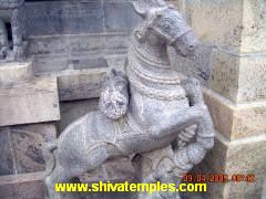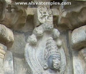 Rishabha Thandava Murthy - The dancing form of Lord Shiva, known as Nataraja or the Lord of Dance, is revered in this specific depiction, Rishabha Thandava, a powerful and dynamic dance, while mounted on his vahana (vehicle) Nandi, the sacred bull. The statue is unique in its portrayal of Lord Shiva with ten hands, each holding a symbolic object or mudra (gesture) that represents various aspects of his divine powers and attributes. This special 'urchava' murthy (processional deity) is honored with dedicated pujas (worship rituals) during the auspicious time of 'pradosha,' when devotees can have 'darshan' of the 'Rishabha Thandava Murthy.' On a pedestal below the 'urchava' murthy are Parvathy, Mahavishnu, Bhairavar and Veerabadhrar, Vinayaka, Sage Naradha, Nandideva, Brungi, Mruganda Maharishi, as well as Gandharvas and Bhoota-ganas.