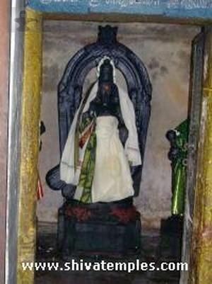 The term 'Amram' denotes mango, and due to the proliferation of mango trees in this region, it acquired the toponym 'Manthurai'. This site is formally known as 'Vadakarai Manthurai'. From Aduthurai, situated along the Kumbakonam-Mayiladuthurai route, proceeding toward Tirupananthal, one encounters another place also known as Manthurai, but distinguished as 'ThenKarai Manthurai'. ThenKarai Manthurai is a 'Thevara Vaippu Sthalam'. This temple complex features an eastern-oriented gopuram (temple tower). Upon traversing the entrance portal, one observes mural depictions illustrating the ascetic Mrugandu engaged in devotional practices directed toward the deity Shiva. The complex encompasses the 'Sthala Vruksham' (sacred tree), and sanctums dedicated to Vinayaka, Muruga, Lakshmi, the Navagrahas (nine celestial bodies), and Bhairava. The Goshta Murthas (peripheral deities) include Dakshinamurthy, Mahavishnu, Brahma, and the goddess Durga. Among the four principal Nayanmars (Shaivite saints), Sundarar is depicted wielding a staff. Within the Navagraha sanctum, Surya, the solar deity, is portrayed accompanied by his two consorts, while the remaining eight Grahas are oriented toward Surya. A supplementary solitary representation of Surya is situated in proximity.