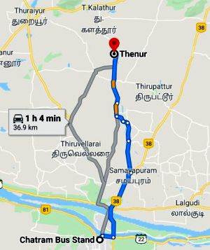 சத்திரம் பேருந்து நிலையத்தில் இருந்து தேனூர் இருப்பிடத்தைக் காட்டும் வரைபடம்